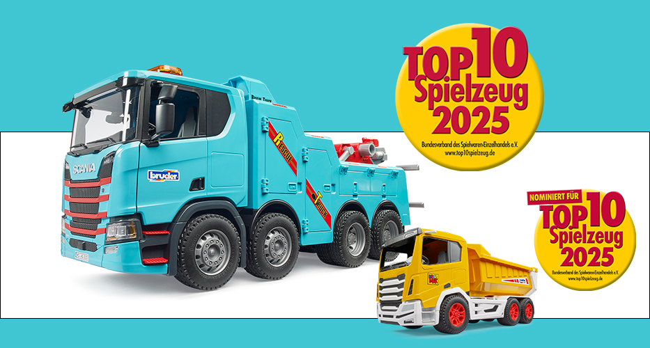 Alle Jahre wieder… fragen sich Eltern, Großeltern, Tanten und Onkel: Was ist ein sinnvolles Weihnachtsgeschenk für den Nachwuchs? Eine hilfreiche Orientierung bietet dabei der Bundesverband Spielwaren-Einzelhandel e.V. (BVS) mit seiner jährlich erscheinenden TOP 10 Spielzeug-Auswahl. Im November gab der Verband nun die diesjährigen Gewinner bekannt. BRUDER Spielwaren durfte sich freuen, der neue Scania Abschlepp-LKW schaffte es auf die begehrte Hitliste.