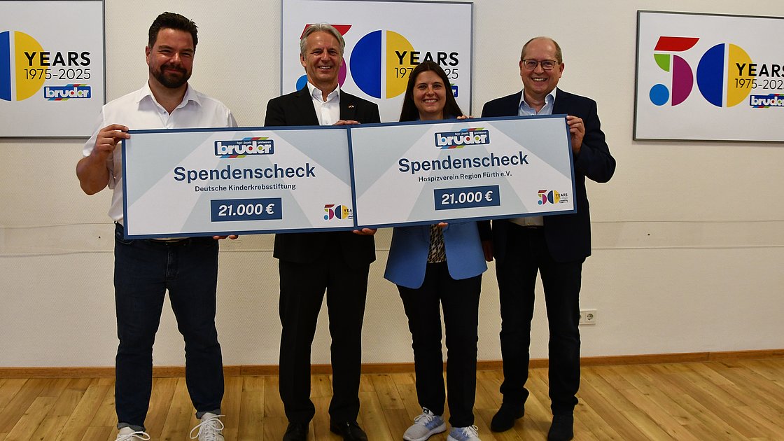 Anlässlich der Feier zum 50. Markenjubiläum im Mai wurden die rund 300 Gäste um Spenden anstelle von Sachgeschenken gebeten. Die Gäste zeigten sich sehr spendabel und BRUDER Spielwaren verdoppelte den Betrag. So konnten nun insgesamt 42.000 Euro an zwei gemeinnützige Organisationen übergeben werden: den Hospizverein Region Fürth e.V. und die Deutsche Kinderkrebsstiftung.